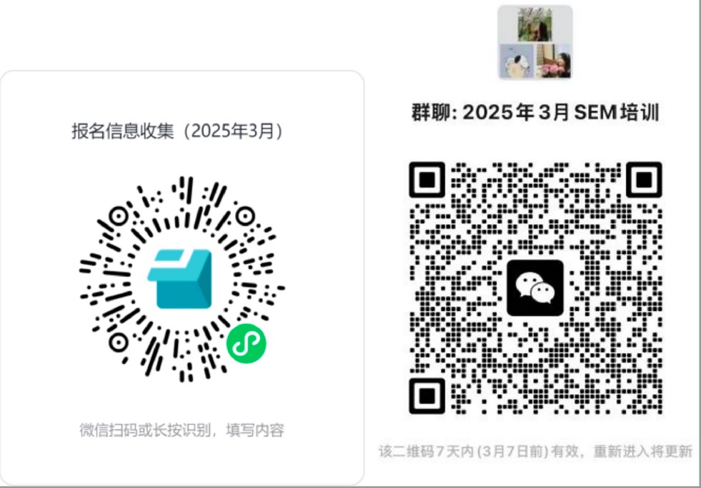 2.请扫描“报名信息收集(2025年3月)”二维码,填写报名信息后,扫描“2025年3月SEM培训”二维码加入群聊,群昵称修改为姓名-学院名称-导师姓名;